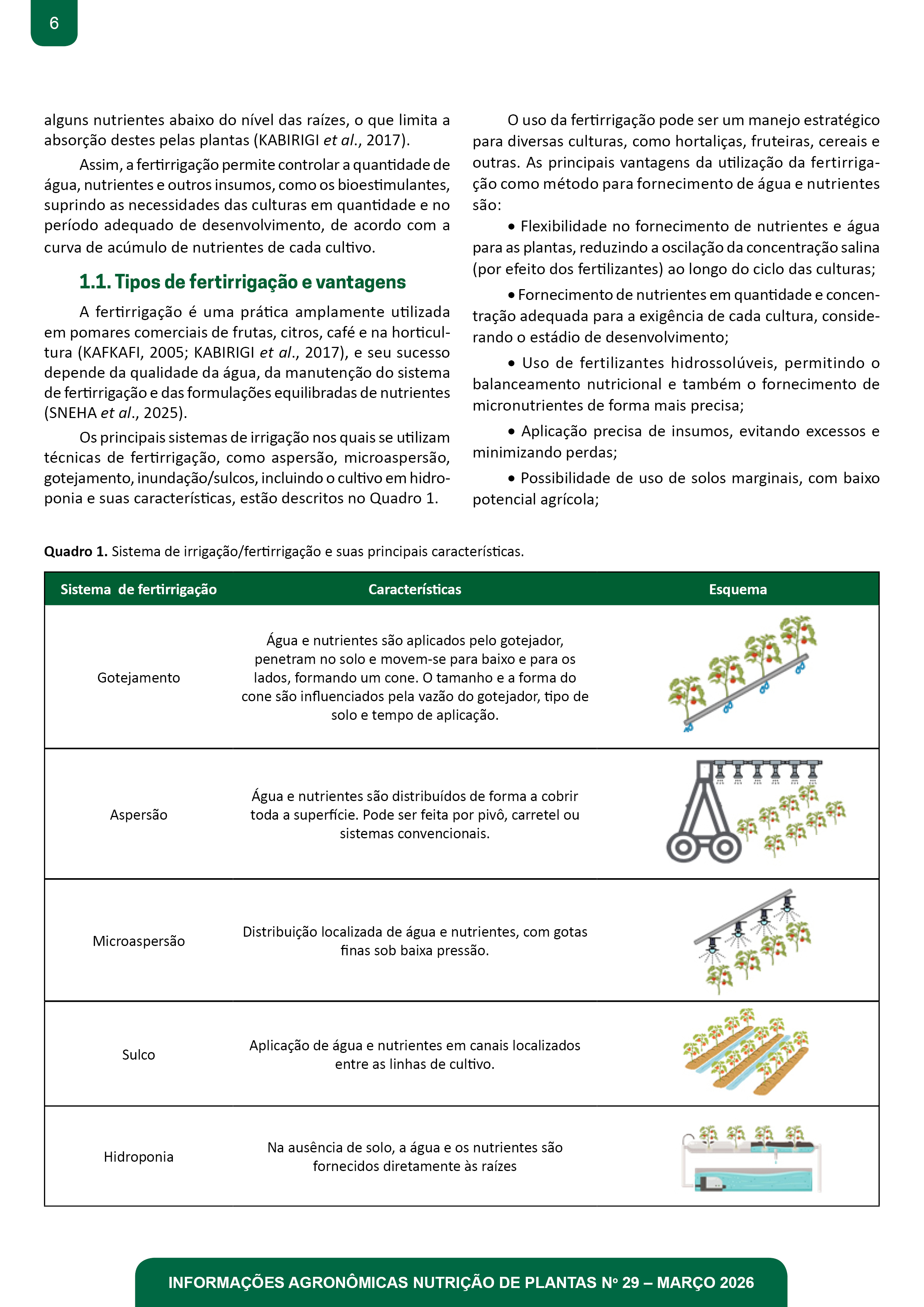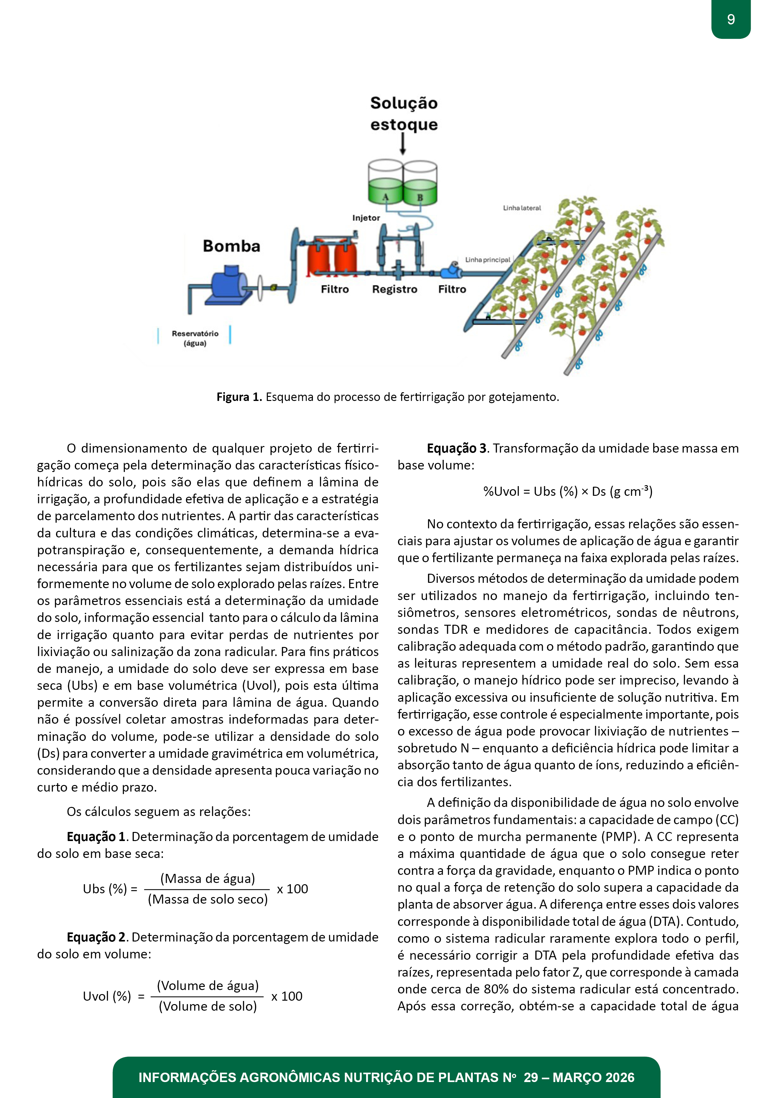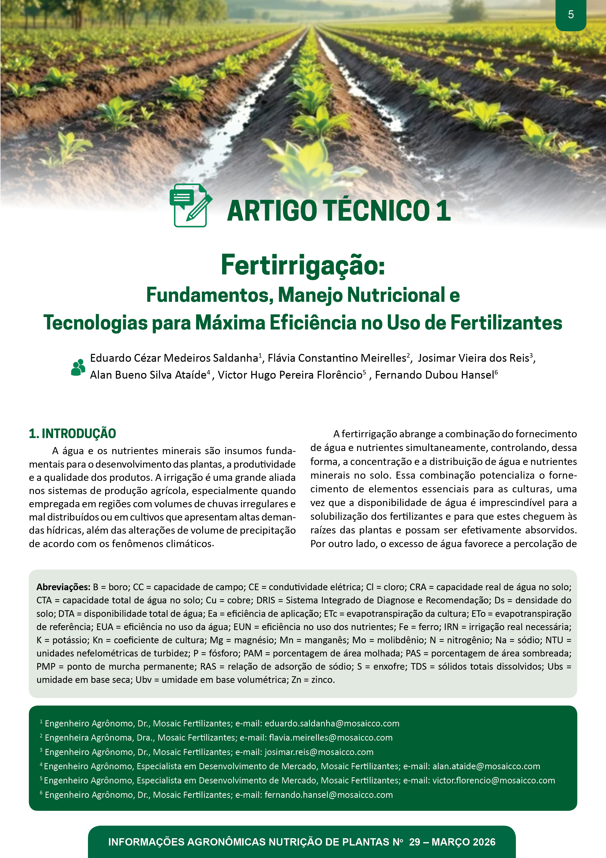 - Pg. 5-23 Artigo Técnico 1: Fertirrigação: Fundamentos, Manejo Nutricional e Tecnologias para Máxima Eficiência no Uso de Fertilizantes Eduardo Cézar Medeiros Saldanha, Flávia Constantino Meirelles, Josimar Vieira dos Reis, Alan Bueno Silva Ataíde,Victor Hugo Pereira Florêncio, Fernando Dubou Hansel