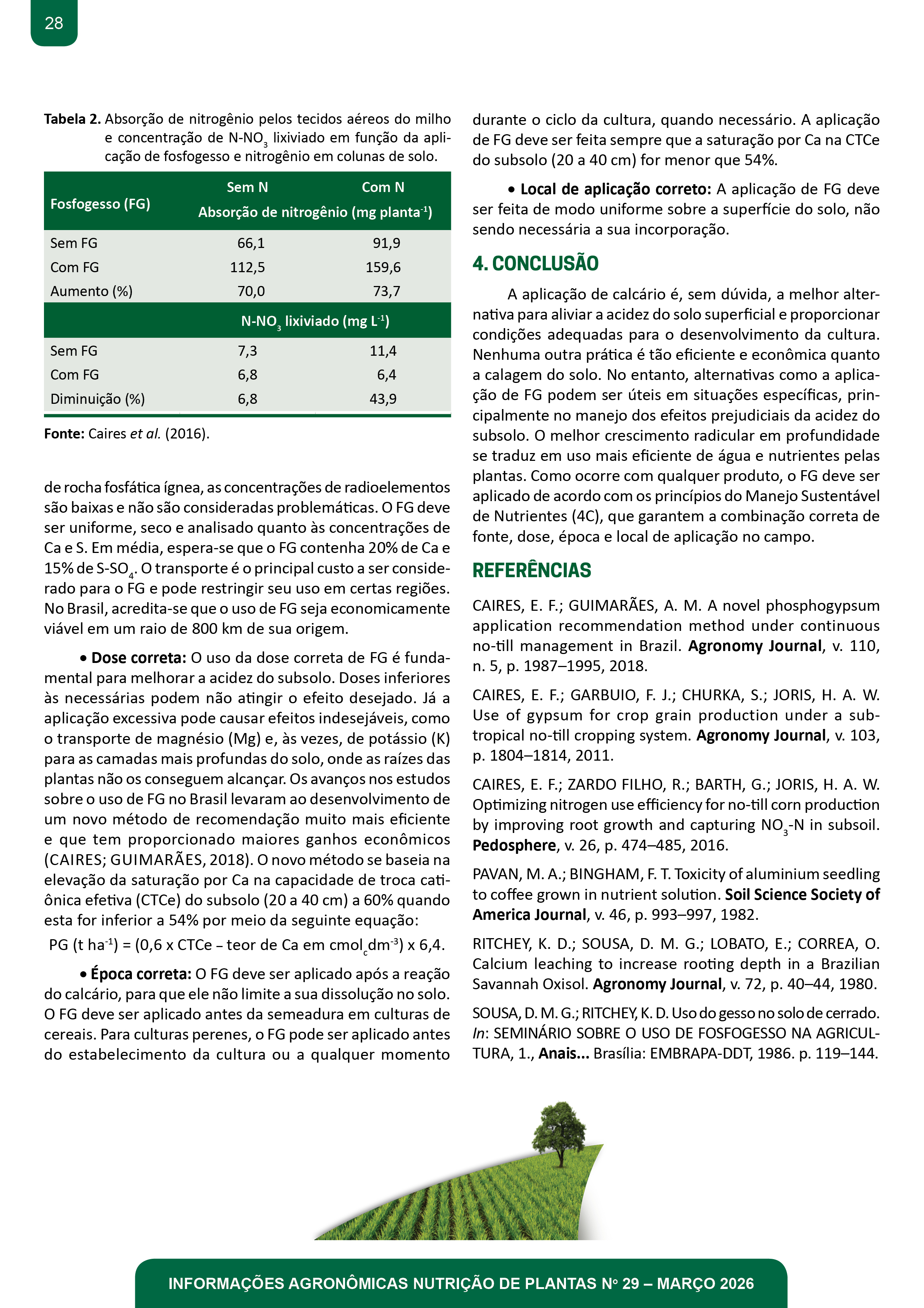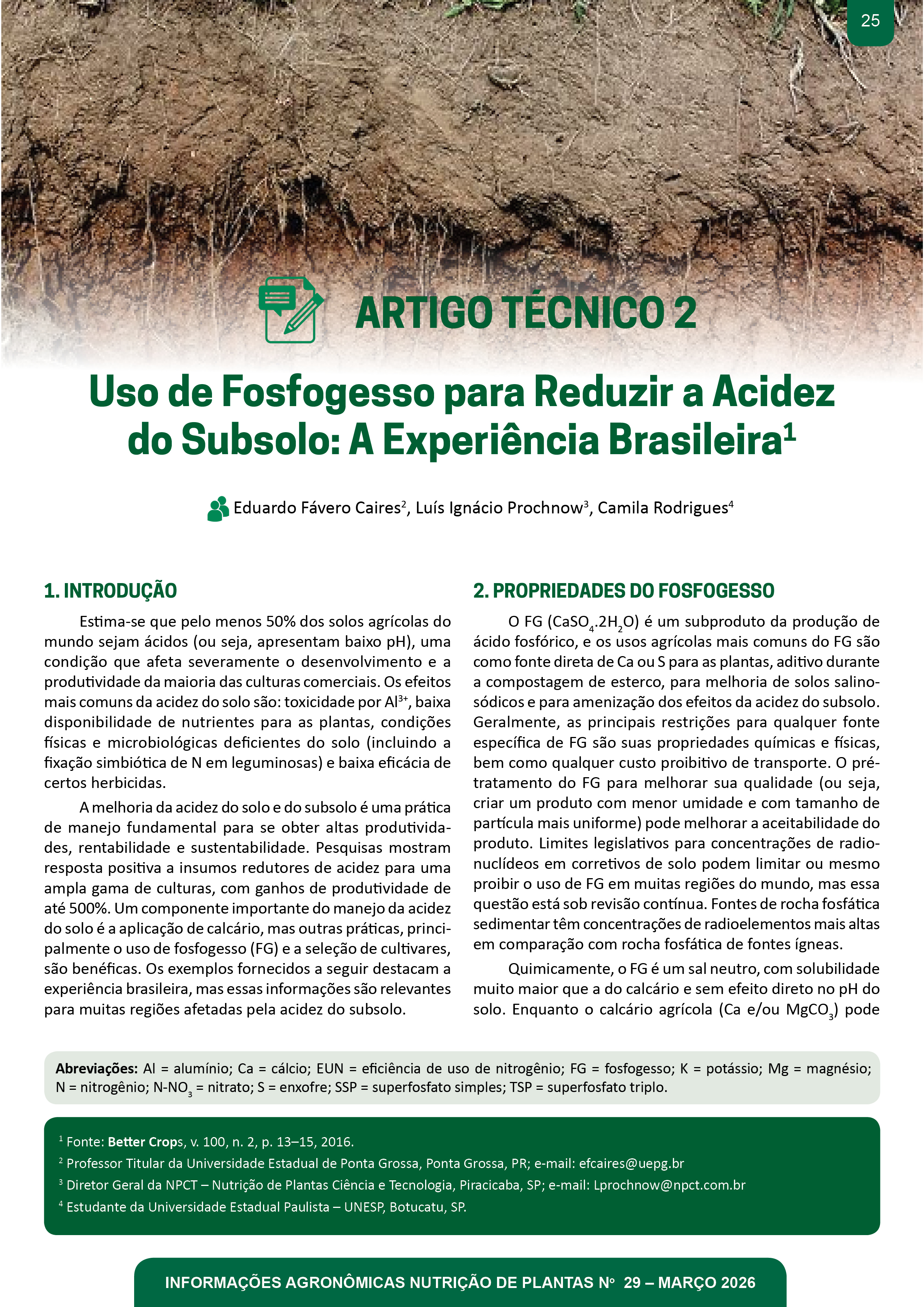 - Pg. 25-28 Artigo Técnico 2: Uso de Fosfogesso para Reduzir a Acidez do Subsolo: A Experiência Brasileira Eduardo Fávero Caires, Luís Ignácio Prochnow, Camila Rodrigues