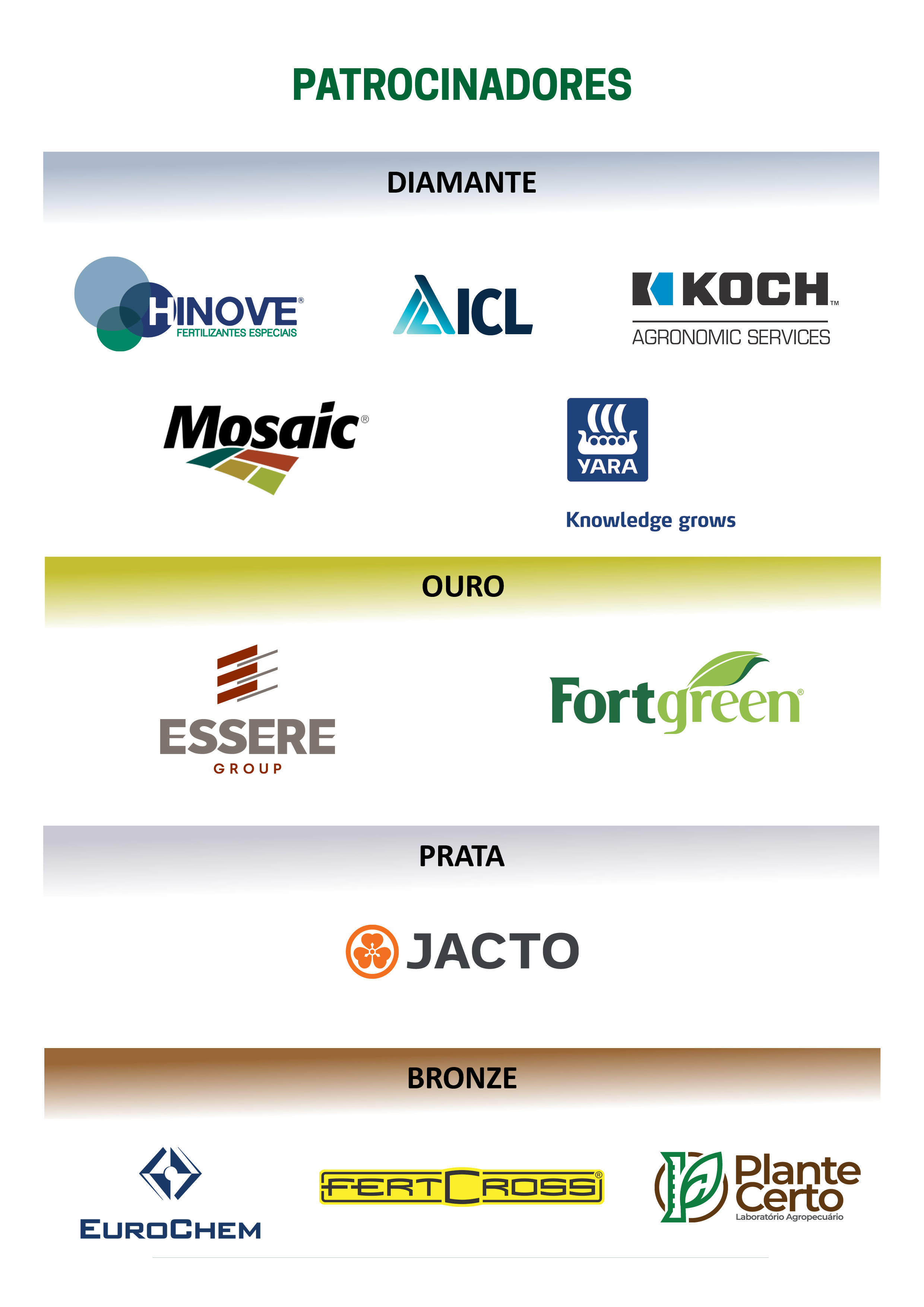 - Pg. 36 Agradecimentos aos Patrocinadores desta Edição DIAMANTE: Hinove Agrociência; ICL Group; Koch Agronomic Services; Mosaic Fertilizantes; Yara Brasil | OURO: Essere Group; FortGreen | PRATA: Jacto | BRONZE: EuroChem; FertCross Leverage e Laboratório Plante Certo