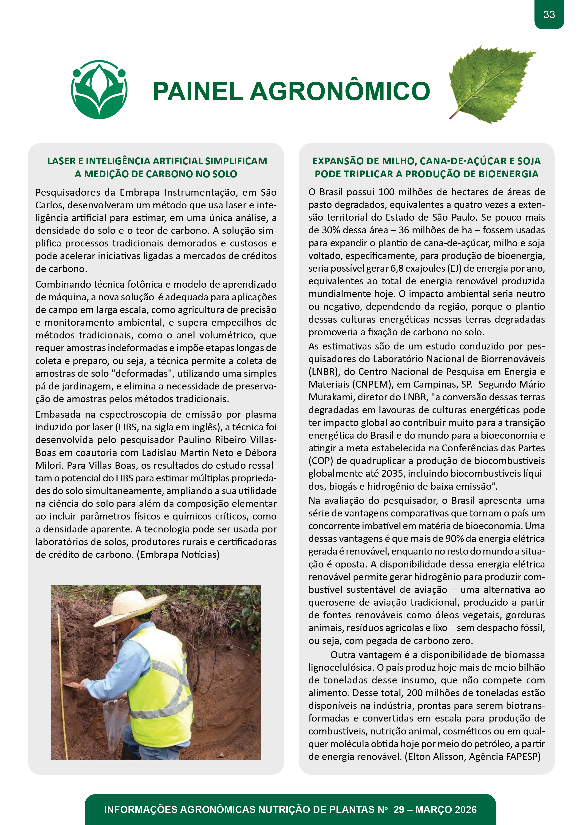 - Pg. 33 Painel Agronômico 1º) Laser e Inteligência Artificial Simplificam a Medição de Carbono no Solo; 2º) Expansão de Milho, Cana-de-Açúcar e Soja pode Triplicar a Produção de Bioenergia