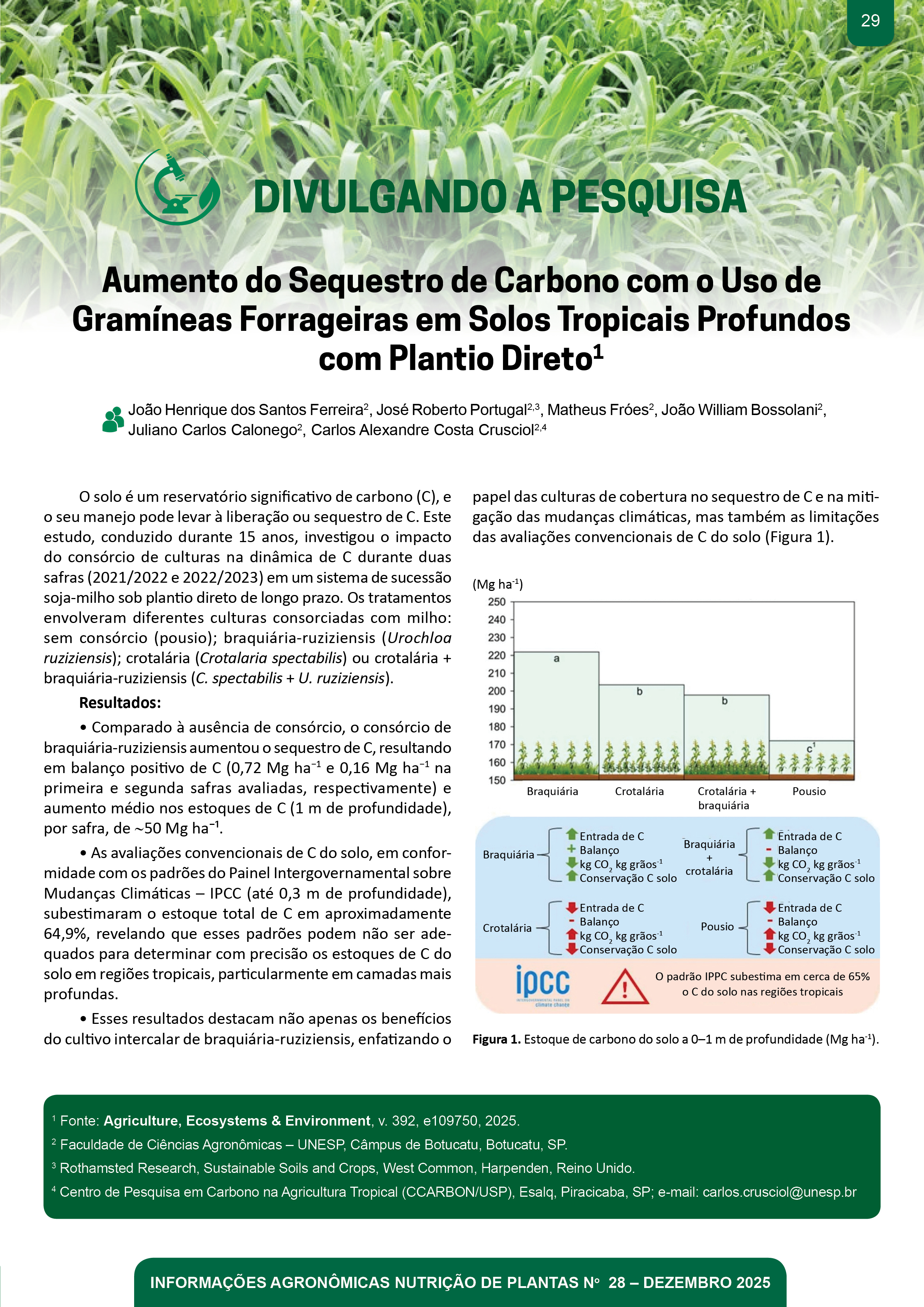 - Pg. 29 Divulgando a Pesquisa: Aumento do Sequestro de Carbono com o Uso de Gramíneas Forrageiras em Solos Tropicais Profundos com Plantio Direto João Henrique dos Santos Ferreira, José Roberto Portugal, Matheus Fróes, João William Bossolani, Juliano Carlos Calonego, Carlos Alexandre Costa Crusciol