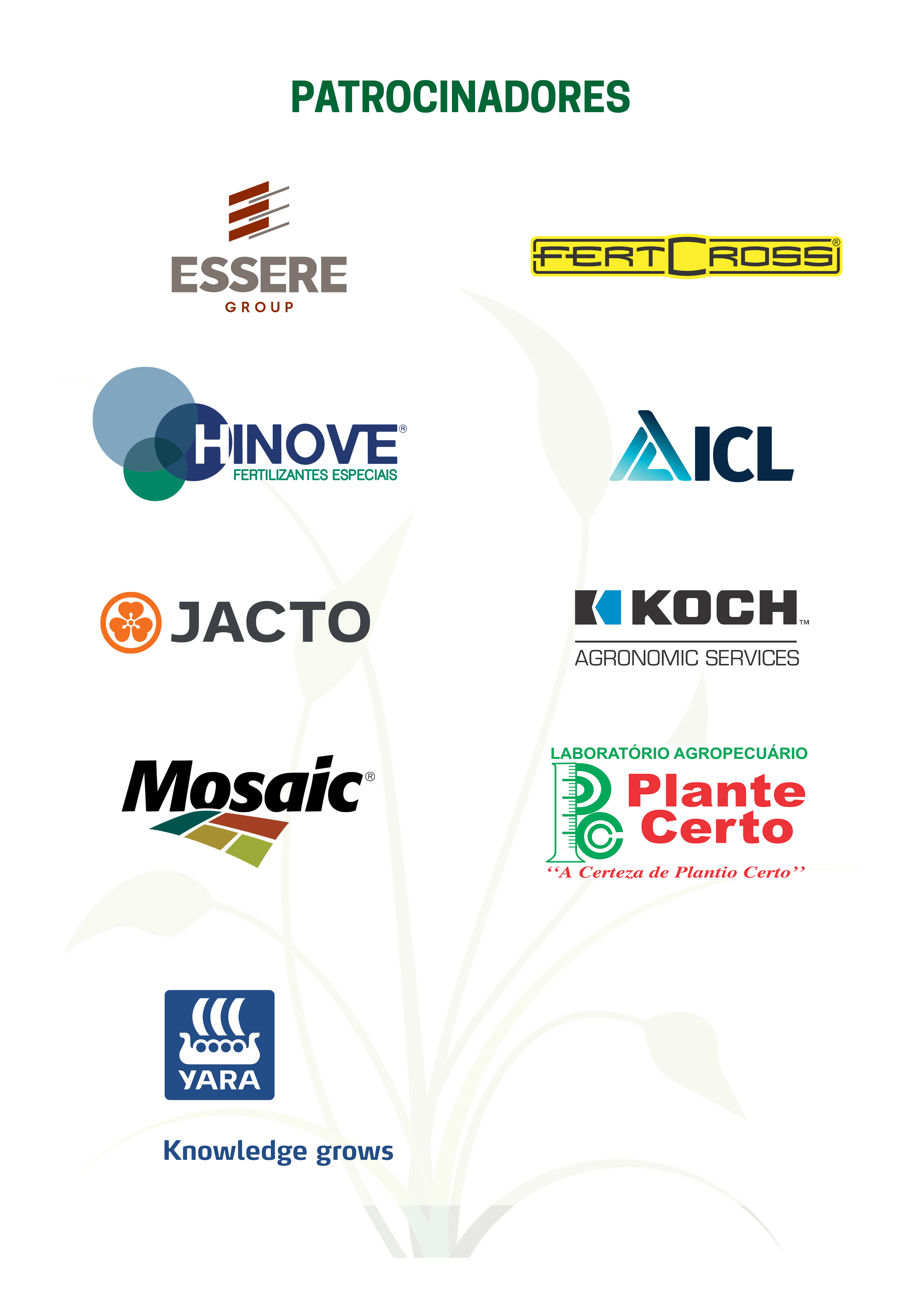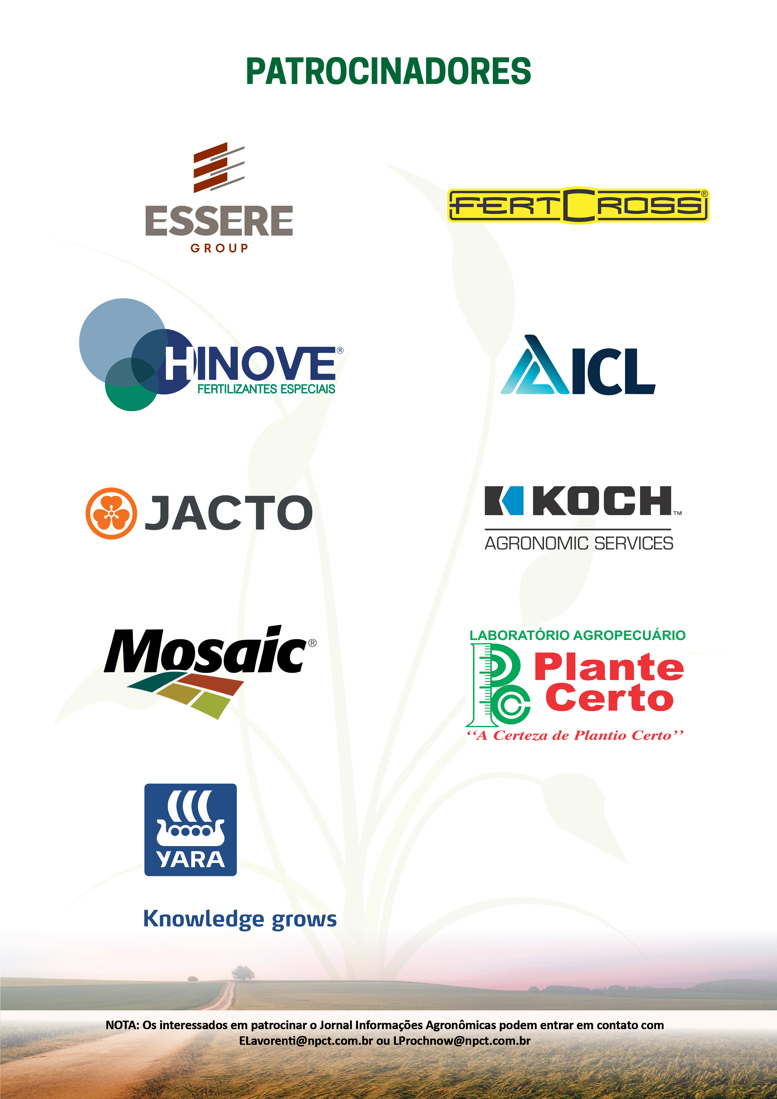 - Pg. 3 Patrocinadores desta Edição Essere Group; Fertcross Leverage; Hinove Agrociência; ICL Group; Jacto; Koch Agronomic Services; Mosaic Fertilizantes; Laboratório Plante Certo e Yara Brasil