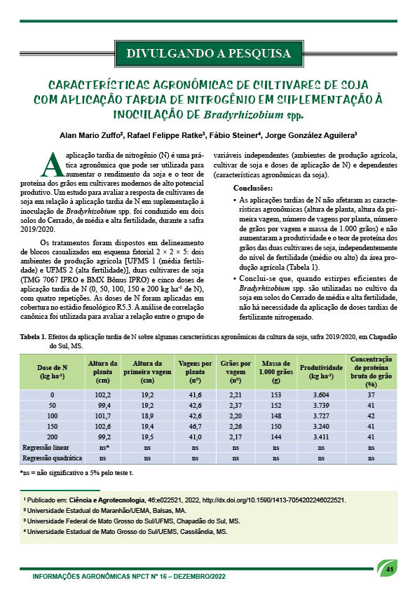 - Pg. 41 Divulgando a Pesquisa: Características Agronômicas de Cultivares de Soja com Aplicação Tardia de Nitrogênio em Suplementação à Inoculação de Bradyrhizobium spp. Alan Mario Zuffo, Rafael Felippe Ratke, Fábio Steiner, Jorge González Aguilera