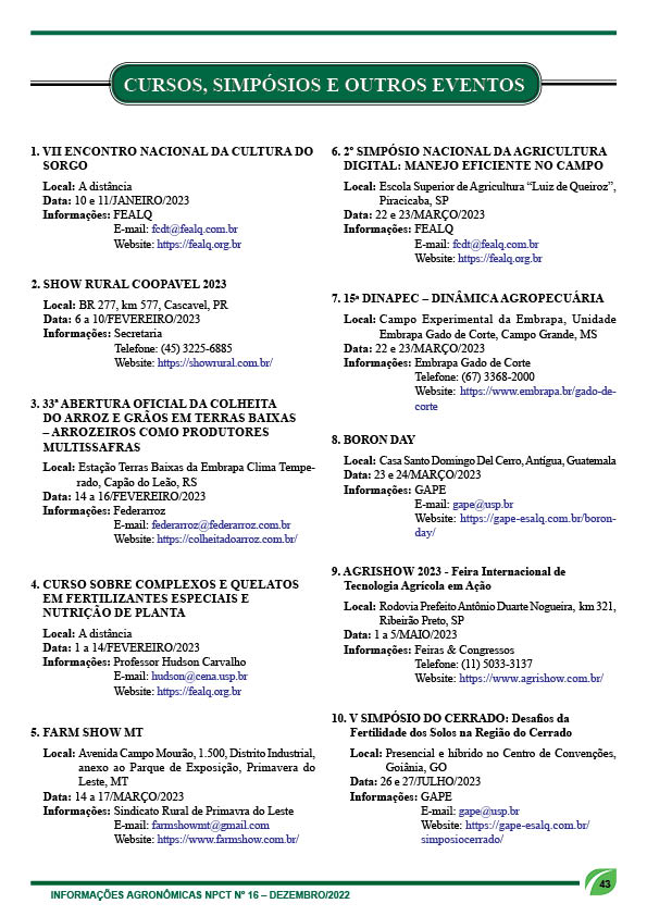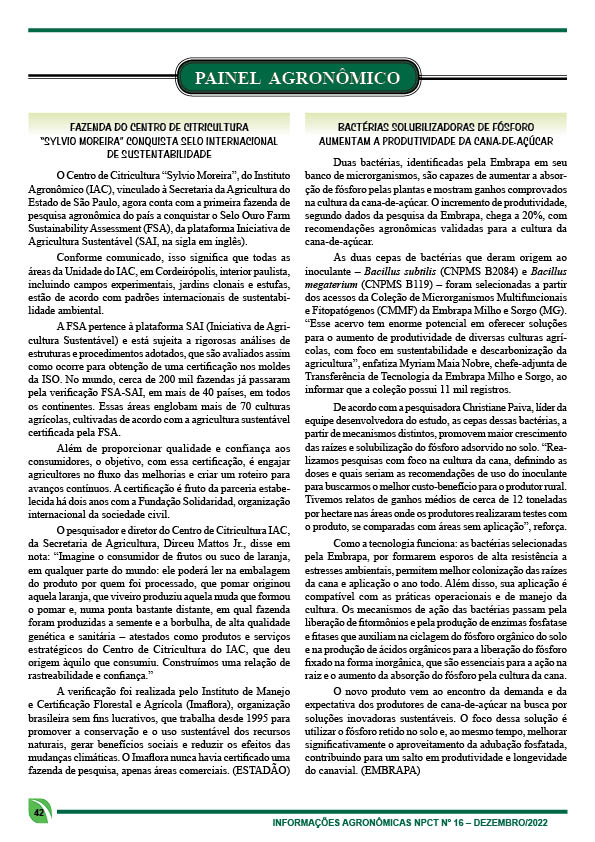 - Pg. 42 Painel Agronômico 1º) Fazenda do Centro de Citricultura “Sylvio Moreira” Conquista Selo Internacional de Sustentabilidade; 2º) Bactérias Solubilizadoras de Fósforo Aumentam a Produtividade da Cana-De-Açúcar