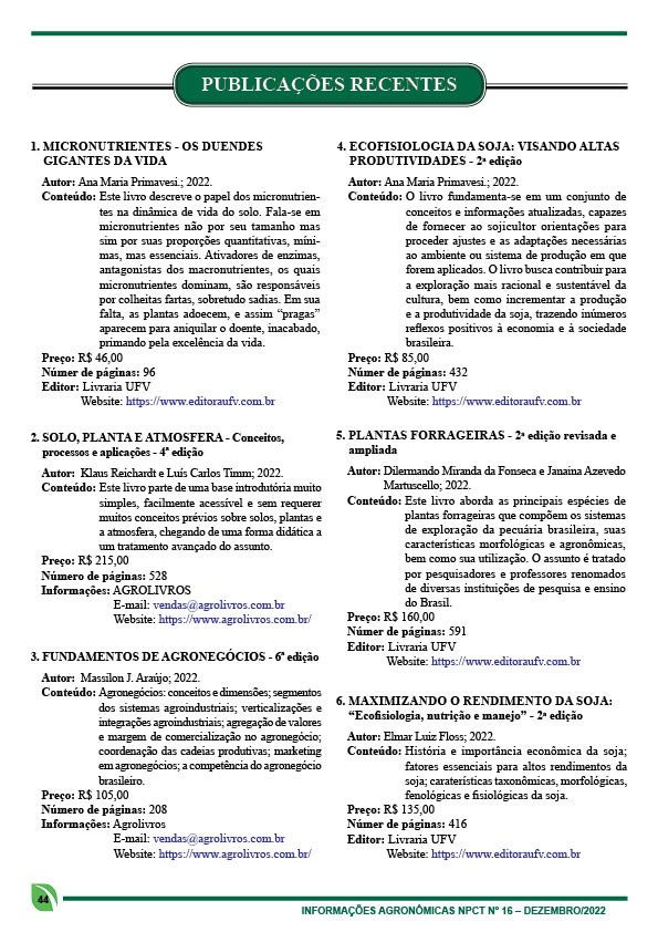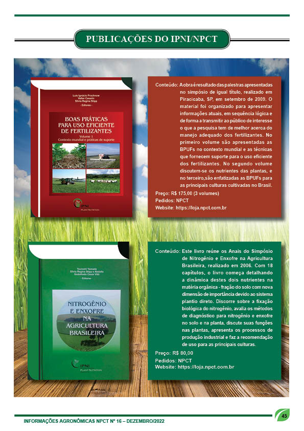 - Pg. 45 Publicação do IPNI/NPCT: Boas Práticas para Uso Eficiente de Fertilizantes (Coleção BPUFs) A obra é resultado das palestras apresentadas no simpósio de igual título, realizado em Piracicaba, SP, em setembro de 2009. O material foi organizado para apresentar informações atuais, em sequência lógica e de forma a transmitir ao público de interesse o que a pesquisa tem de melhor acerca do manejo adequado dos fertilizantes. No primeiro volume são apresentadas as BPUFs no contexto mundial e as técnicas que fornecem suporte para o uso eficiente dos fertilizantes. No segundo volume discutem-se os nutrientes das plantas, e no terceiro,são enfatizadas as BPUFs para as principais culturas cultivadas no Brasil.